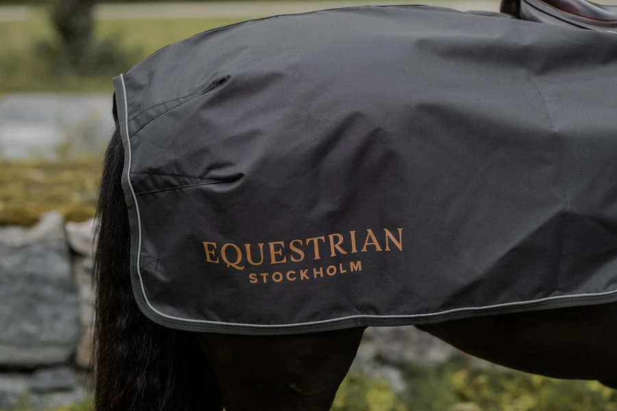 Exclusive exercise horse rug crafted in water resistant material. Perfect for both rainy days and for warming up before your next training session or competition. The luxurious blue nuance is paired with details in rose gold and dark grey, such as a printed rose golden Equestrian Stockholm logo on the left side. Reflex alongside the brim. Close the rug with adjustable double Velcro fasteners around the neck and stomach. Buckles in rose gold.